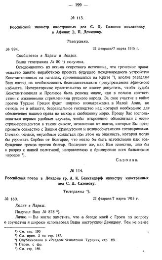 Российский посол в Лондоне гр. А.К. Бенкендорф министру иностранных дел С.Д. Сазонову. Телеграмма. № 160. 22 февраля/7 марта 1915 г.