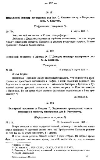 Российский посланник в Афинах Э.П. Демидов министру иностранных дел С.Д. Сазонову. Телеграмма. № 81. 18 февраля/3 марта 1915 г.