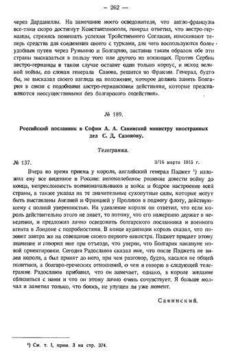 Российский посланник в Софии А.А. Савинский министру иностранных дел С.Д. Сазонову. Телеграмма. № 137. 3/16 марта 1915 г.