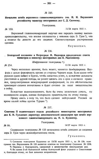 Начальник штаба верховного главнокомандующего ген. H.Н. Янушкевич российскому министру иностранных дел С.Д. Сазонову. Телеграмма. № 133. 11/24 марта 1915 г.