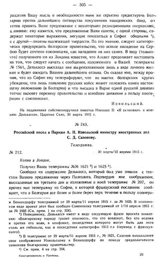 Российский посол в Париже А.П. Извольский министру иностранных дел С.Д. Сазонову. Телеграмма. № 212. 30 марта/12 апреля 1915 г.