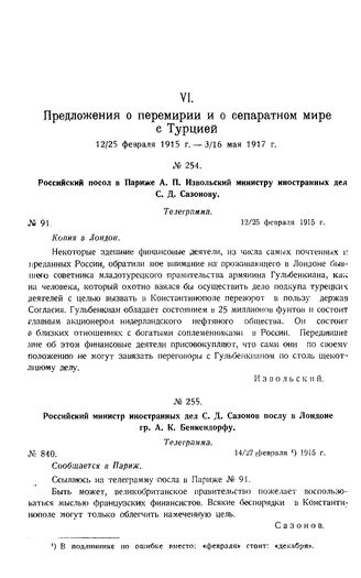 Российский посол в Париже А.П. Извольский министру иностранных дел С.Д. Сазонову. Телеграмма. № 91. 12/25 февраля 1915 г.