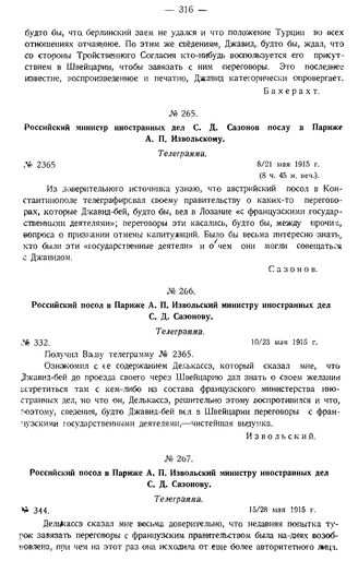 Российский посол в Париже А.П. Извольский министру иностранных дел С.Д. Сазонову. Телеграмма. № 344. 15/28 мая 1915 г.