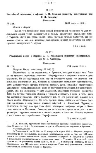 Российский посол в Париже А.П. Извольский министру иностранных дел С.Д. Сазонову. Телеграмма. № 173. 1/14 марта 1916 г.