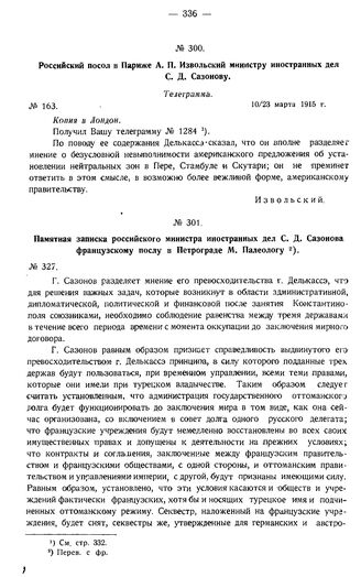 Российский посол в Париже А.П. Извольский министру иностранных дел С.Д. Сазонову. Телеграмма. № 163. 10/23 марта 1915 г.