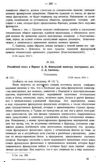 Российский посол в Париже А.П. Извольский министру иностранных дел С.Д. Сазонову. Телеграмма. № 173. 13/26 марта 1915 г.