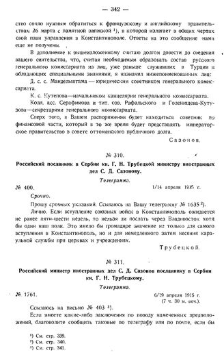 Российский посланник в Сербии кн. Г.Н. Трубецкой министру иностранных дел С.Д. Сазонову. Телеграмма. № 400. 1/14 апреля 1915 г.