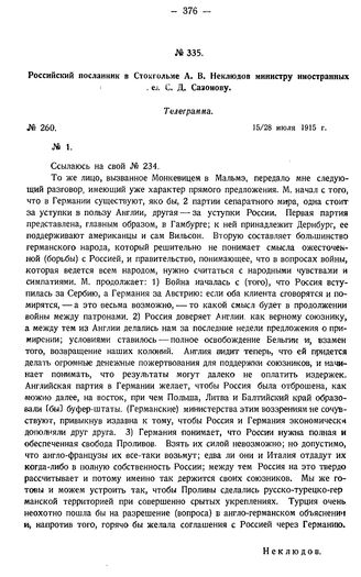 Российский посланник в Стокгольме А.В. Неклюдов министру иностранных дел С.Д. Сазонову. Телеграмма. № 260. 15/28 июля 1915 г. [1]