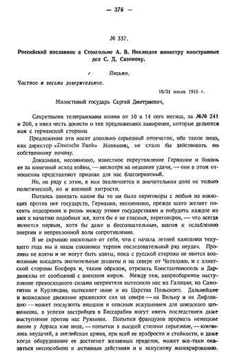 Российский посланник в Стокгольме А.В. Неклюдов министру иностранных дел С.Д. Сазонову. Письмо. 18/31 июля 1915 г.