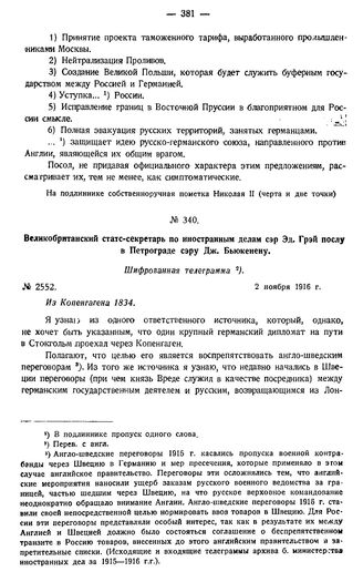 Великобританский статс-секретарь по иностранным делам сэр Эд. Грэй послу в Петрограде сэру Дж. Бьюкенену. Шифрованная телеграмма. № 2552. 2 ноября 1916 г.