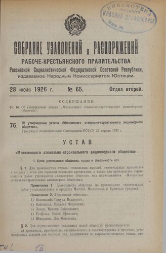 Об утверждении устава «Московского стекольно-строительного акционерного общества». Утвержден Экономическим Совещанием РСФСР 23 апреля 1926 г.