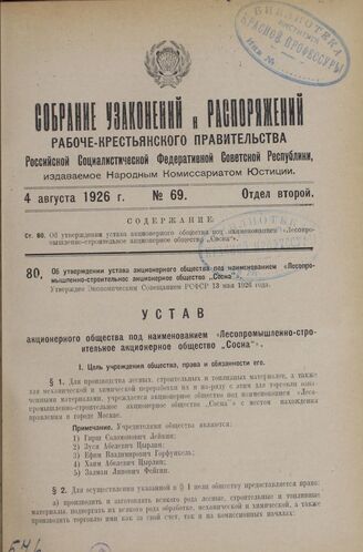 Об утверждении устава акционерного общества под наименованием лесопромышленно-строительное акционерное общество „Сосна"». Утвержден Экономическим Совещанием РСФСР 13 мая 1926 года