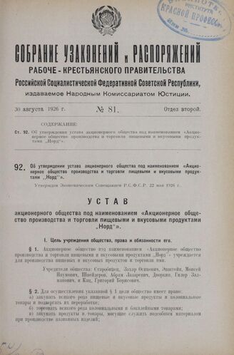 Об утверждении устава акционерного общества под наименованием «Акционерное общество производства и торговли пищевыми и вкусовыми продуктами „Норд“». Утвержден Экономическим Совещанием Р.С.Ф.С.Р. 22 мая 1926 г.