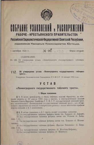 Собрание узаконений и распоряжений Рабоче-Крестьянского правительства РСФСР за 1926 г. № 99-130. Отдел второй. — М., [1926].