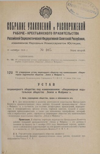Об утверждении устава акционерного общества под наименованием: «Акционерное издательское общество „Земля и Фабрика"». Утвержден Экономическим Совещанием Р.С.Ф.С.Р. 11 июня 1926 года