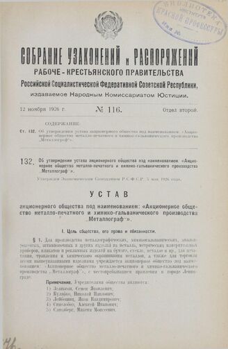 Об утверждении устава акционерного общества под наименованием: «Акционерное общество металло-печатного и химико-гальванического производства „Металлограф"». Утвержден Экономическим Совещанием Р.С.Ф.С.Р. 5 мая 1926 года