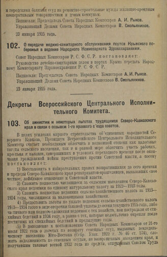 Декрет Совета Народных Комиссаров. О передаче медико-санитарного обслуживания портов Крымского побережья в ведение Народного Комиссариата Здравоохранения. 23 января 1925 г.