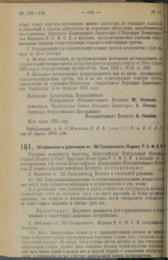 Декрет Всероссийского Центрального Исполнительного Комитета и Совета Народных Комиссаров. Об изменении и дополнении ст. 182 Гражданского Кодекса Р.С.Ф.С.Р. 30 марта 1925 г.