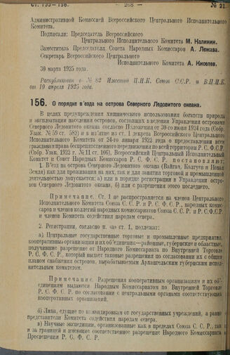 Декрет Всероссийского Центрального Исполнительного Комитета и Совета Народных Комиссаров. О порядке въезда на острова Северного Ледовитого океана. 30 марта 1925 г. // Распубликован в № 85 Известий Ц.И.К. Союза С.C.P. и В.Ц.И.К. от 14 апреля 1925 г.