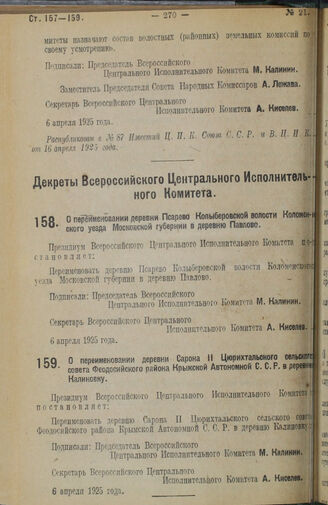 Декрет Всероссийского Центрального Исполнительного Комитета. О переименовании деревни Сарона II Цюрихтальского сельсовета Феодосийского района Крымской Автономной С.С.Р. в деревня Калиновку. 6 апреля 1925 г.
