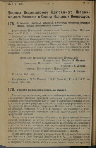 Декрет Всероссийского Центрального Исполнительного Комитета и Совета Народных Комиссаров. О порядке финансирования земельных комиссий. 13 апреля 1925 г.
