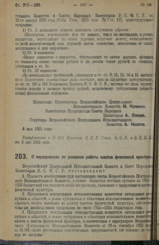 Декрет Всероссийского Центрального Исполнительного Комитета и Совета Народных Комиссаров. О мероприятиях по усилению работы советов физической культуры. 4 мая 1925 г.