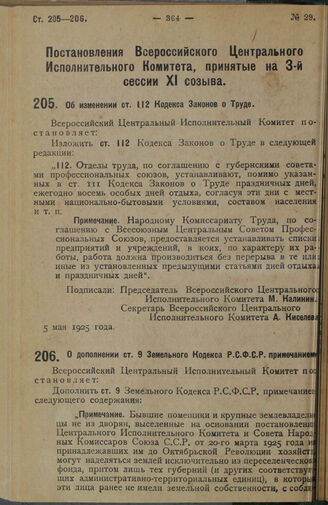 Постановление Всероссийского Центрального Исполнительного Комитета, принятое на 3-й сессии XI созыва. Об изменении ст. 112 Кодекса Законов о Труде. 5 мая 1925 г.