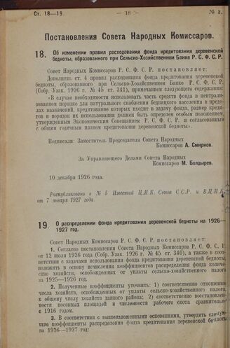 Постановление Совета Народных Комиссаров. О распределении фонда кредитования деревенской бедноты на 1926-1927 год. 17 декабря 1926 г. // Распубликовано в № 4 Известий Ц.И.К. Союза С.С.Р. и В.Ц.И.К. от 6 января 1927 г.