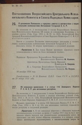 Постановление Всероссийского Центрального Испол­нительного Комитета и Совета Народных Комиссаров. О дополнении Положения о городских советах в соответствии с национальными особенностями Автономной Татарской С.С.Р. 20 декабря 1926 г.