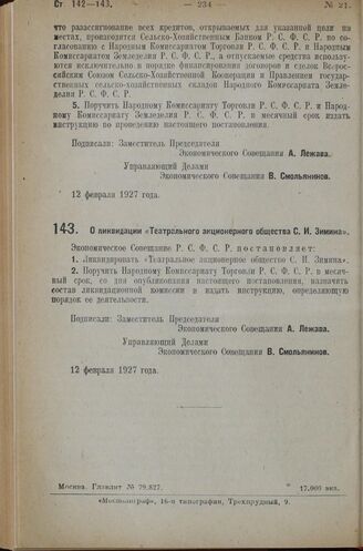 Постановление Экономического Совещания. О ликвидации «Театрального акционерного общества С.И. Зимина». 12 февраля 1927 г.