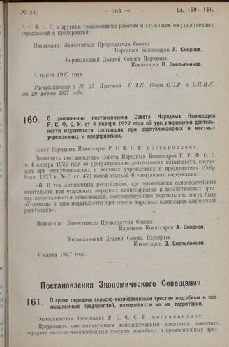 Главная Собрание законов и распоряжений правительства РСФСР и СССР Собрание законов и распоряжений Рабоче-Крестьянского Правительства ... Собрание узаконений и распоряжений Рабочего и Крестьянского правите... Собрание узаконений и распоряжений Рабоче-Крестьянского правительст... Документы Постановление Экономического Совещания. О сроке передачи сельско-хо...