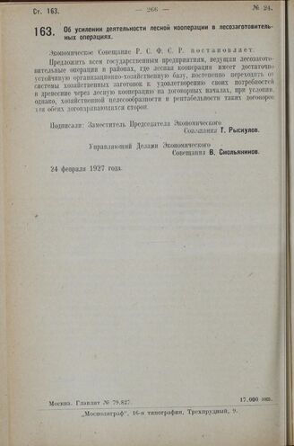 Постановление Экономического Совещания. Об усилении деятельности лесной кооперации в лесозаготовительных операциях. 24 февраля 1927 г.