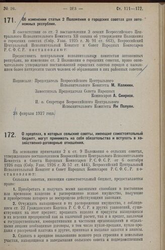 Постановление Всероссийского Центрального Испол­нительного Комитета и Совета Народных Комиссаров. Об изменении статьи 2 Положения о городских советах для автономных республик. 28 февраля 1927 г.