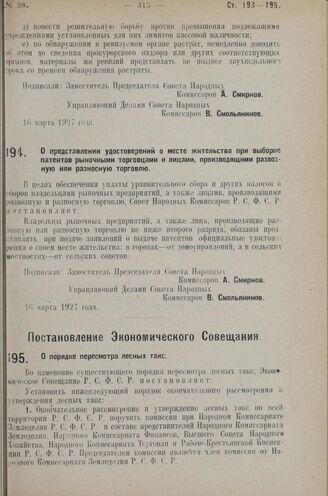 Постановление Экономического Совещания. О порядке пересмотра лесных такс. 5 марта 1927 г.
