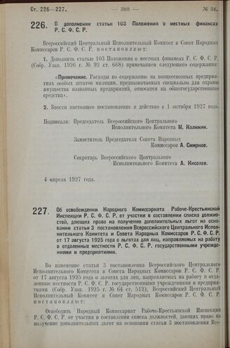 Постановление Всероссийского Центрального Исполнительного Коми­тета и Совета Народных Комиссаров. О дополнении статьи 103 Положения о местных финансах Р.С.Ф.С.Р. 4 апреля 1927 г.