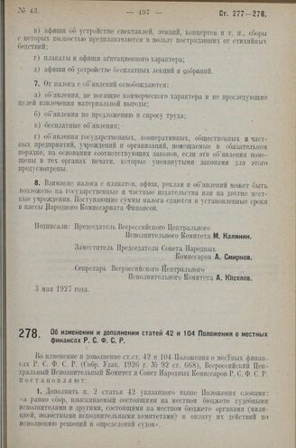 Постановление Всероссийского Центрального Исполнительного Коми­тета и Совета Народных Комиссаров. Об изменении и дополнении статей 42 и 104 Положения о местных финансах Р.С.Ф.С.Р. 3 мая 1927 г.