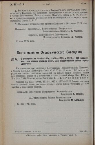 Постановление Экономического Совещания. О снижении на 1923-1924, 1924-1925 и 1925-1926 бюджетные годы ставки основной ренты для внеселитебных земель города Оренбурга. 12 мая 1927 г.