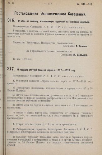 Постановление Экономического Совещания. О цене на живицу, извлекаемую подсочкой из сосновых деревьев. 12 мая 1927 г.