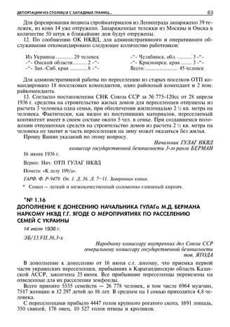 Дополнение к донесению начальника ГУЛАГа М.Д. Бермана наркому НКВД Г.Г. Ягоде о мероприятиях по расселению семей с Украины. 14 июля 1936 г. // ГАРФ. Ф. Р-9479. Оп. 1. Д. 36. Л. 12-16. Копия; Дугин, 1999. С. 72-73. № 84.