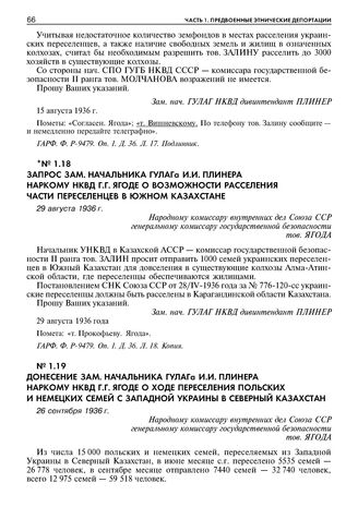 Запрос зам. начальника ГУЛАГа И.И. Плинера наркому НКВД Г.Г. Ягоде о возможности расселения части переселенцев в Южном Казахстане. 29 августа 1936 г. // ГАРФ. Ф. Р-9479. Оп. 1. Д.36. Л. 18. Копия.