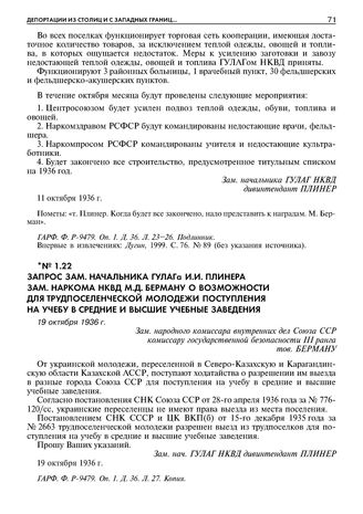 Запрос зам. начальника ГУЛАГа И.И. Плинера зам. наркома НКВД М.Д. Берману о возможности для трудпоселенческой молодежи поступления на учебу в средние и высшие учебные заведения. 19 октября 1936 г.