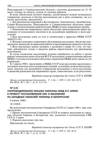 Сопроводительное письмо наркома НКВД Л.П. Берии к проекту постановления СНК о выселении из западных областей Украины и Белоруссии. 5 апреля 1940 г. // Органы государственной безопасности... Т. 1. Кн. 1. 1995. С. 168. № 81; ЦА ФСБ. Ф. 3. Оп. 7. Д. 14. Л. 299.
