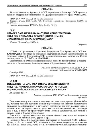 Обращение начальника отдела спецпереселений НКВД И.В. Иванова в Наркомзем СССР по поводу трудоустройства немцев-переселенцев в КазССР. 21 октября 1941 г. // ГАРФ. Ф. Р-9479. Оп. 1. Д. 84. Л. 62. Машинопись; Депортации народов СССР, 1995. С. 215-216. № 56.