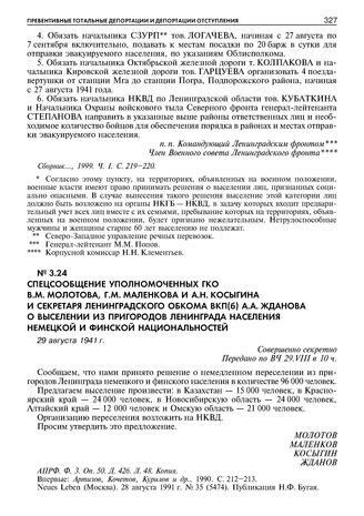Спецсообщение уполномоченных ГКО В.М. Молотова, Г.М. Маленкова и А.Н. Косыгина и секретаря Ленинградского обкома ВКП(б) А.А. Жданова о выселении из пригородов Ленинграда населения немецкой и финской национальностей. 29 августа 1941 г. // АПРФ. Ф. 3. Оп. 50. Д. 426. Л. 48. Копия; Артизов, Кочетов, Курилов и др., 1990. С. 212-213; Neues Leben (Москва). 28 августа 1991 г. № 35 (5474).