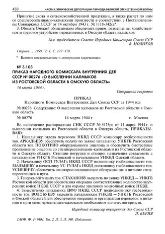 Приказ народного комиссара внутренних дел СССР № 00276 «О выселении калмыков из Ростовской области в Омскую область». 14 марта 1944 г.
