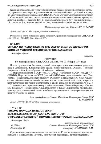Письмо наркома НКВД Л.П. Берии зам. председателя СНК СССР В.М. Молотову о продовольственной помощи депортированным калмыкам. 29 октября 1945 г.