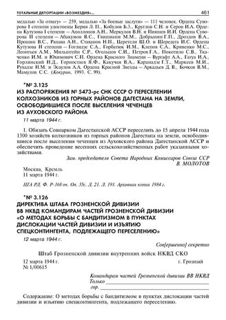 Директива штаба Грозненской дивизии ВВ НКВД командирам частей Грозненской дивизии «О методах борьбы с бандитизмом в пунктах дислокации частей дивизии и изъятию спецконтингента, подлежащего переселению». 12 марта 1944 г.