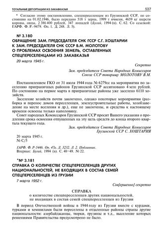 Справка о количестве спецпереселенцев других национальностей, не входящих в состав семей спецпереселенцев из Грузии. 7 марта 1952 г. // ГАРФ. Ф. Р-9479. Оп. 1. Д. 436. Л. 26.