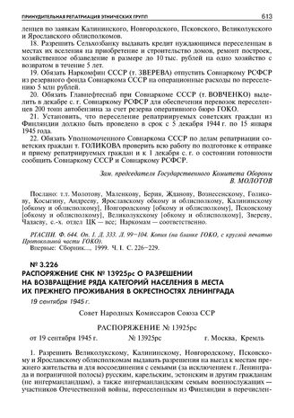 Распоряжение СНК № 13925рс о разрешении на возвращение ряда категорий населения в места их прежнего проживания в окрестностях Ленинграда. 19 сентября 1945 г. // Сборник..., 1999. Ч.1. С. 230-231.