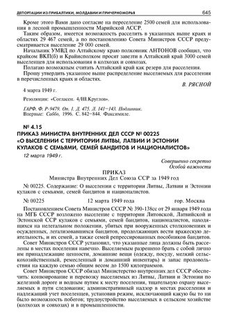 Приказ министра внутренних дел СССР № 00225 «О выселении с территории Литвы, Латвии и Эстонии кулаков с семьями, семей бандитов и националистов». 12 марта 1949 г.